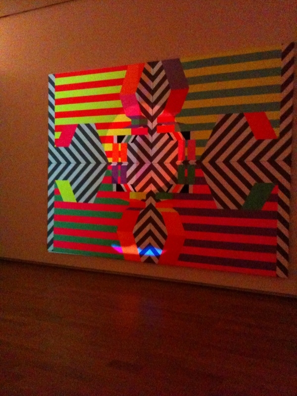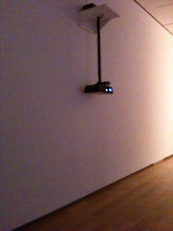 In one of the galleries hangs MS Video Painting II, 2010 (canvas, gouache, DVD), a canvas painted in a somewhat op art fashion with stripes and flat shapes , a completed work in itself. Suspended opposite the canvas is a projector that projects moving designs in light, altering the appearance of the painted composition. Thus the canvas becomes a different work of art. (Edit: Both images courtesy of Amanda Potter’s iPhone.)